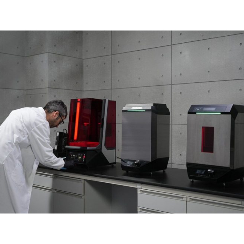 El dispositivo de post-curado Raise3D DF Cure permite un post-procesado fácil y eficiente completamente integrado en el ecosistema de la impresora 3D de resina DLP DF2.