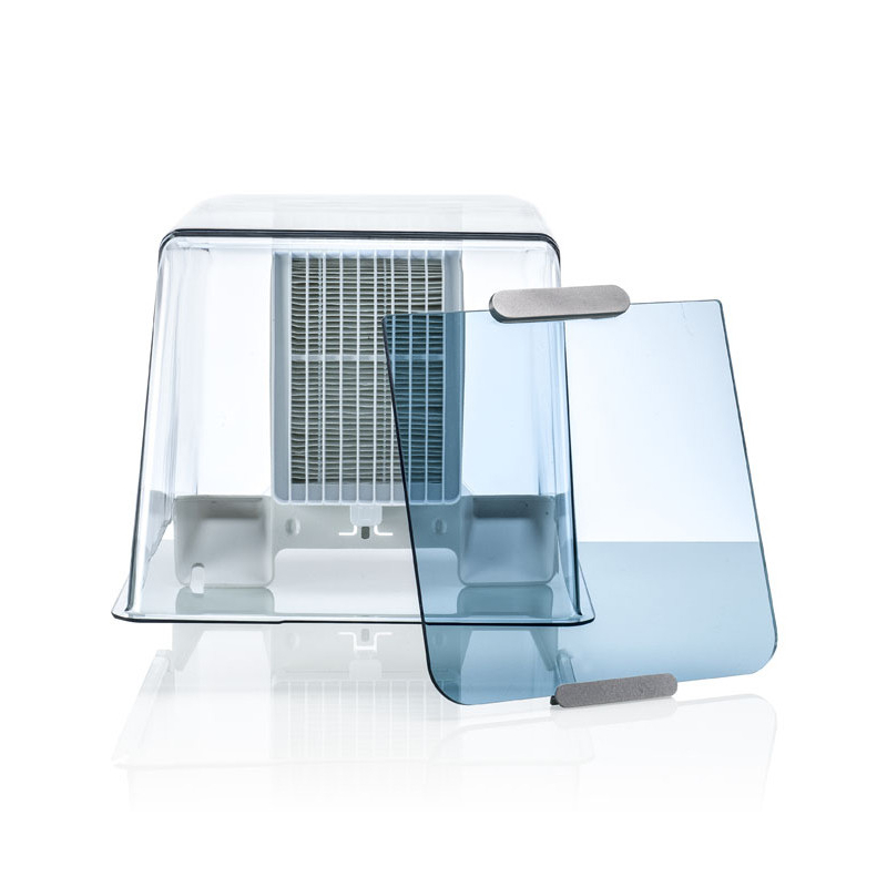 El Air Manager opcional para la Ultimaker 2+ Connect está diseñado para mejorar la seguridad del usuario de manera sencilla y eficaz. El Air Manager consta de una cubierta superior, un filtro y una puerta frontal. El uso correcto del Air Manager minimiza los riesgos de emisiones de partículas finas causadas por los materiales de impresión 3D.