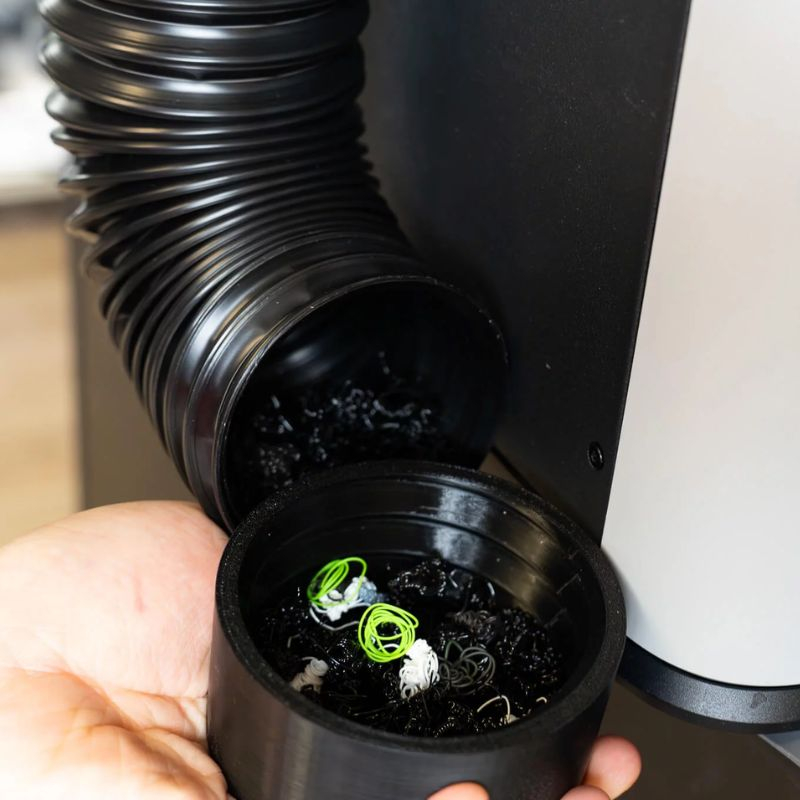 Los residuos de filamento se recogen eficazmente en el conducto de aire flexible incluido en el kit. Para limpiar y retirar los residuos acumulados, basta con desenroscar el tubo. Este diseño práctico facilita el mantenimiento y mantiene el área de trabajo limpia y segura durante la impresión 3D con impresoras Bambu Lab H2.