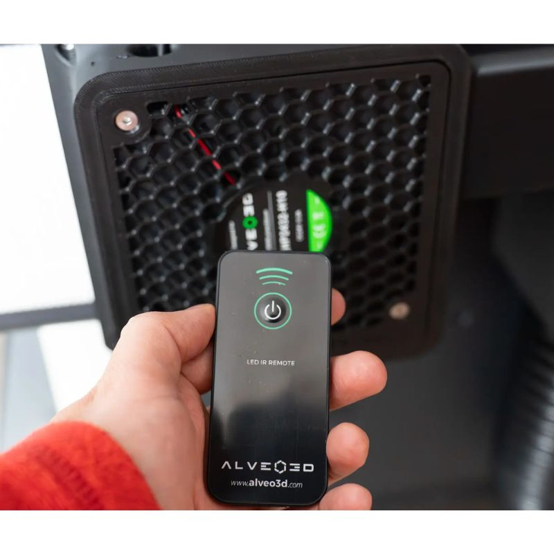 El kit de filtración se puede controlar fácilmente con un mando a distancia, permitiendo activar el sistema sin interactuar directamente con la impresora. Esto permite filtrar en el momento oportuno, optimizar la gestión energética y mantener un entorno de trabajo más saludable sin interrumpir las impresiones.