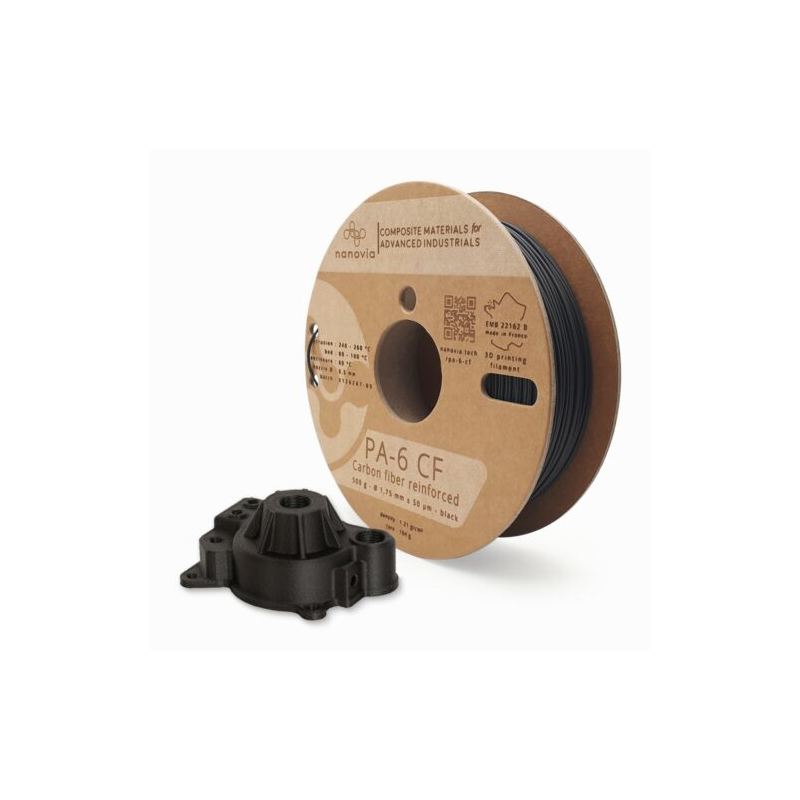 El Nanovia PA-6 CF - 1,75 mm - 500 g es un filamento de nylon reforzado con fibras de carbono diseñado para impresión 3D profesional. Sus fibras reducen la contracción, permiten imprimir más rápido y proporcionan mayor resistencia mecánica.