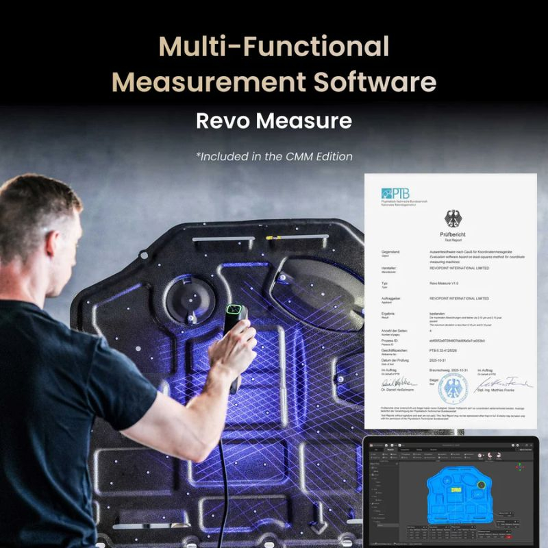 Esta edición CMM integra además un flujo de trabajo metrológico avanzado con la Ball Plate certificada CMM y el software Revo Measure, permitiendo transformar directamente los escaneos en mediciones 3D verificables para control de calidad.