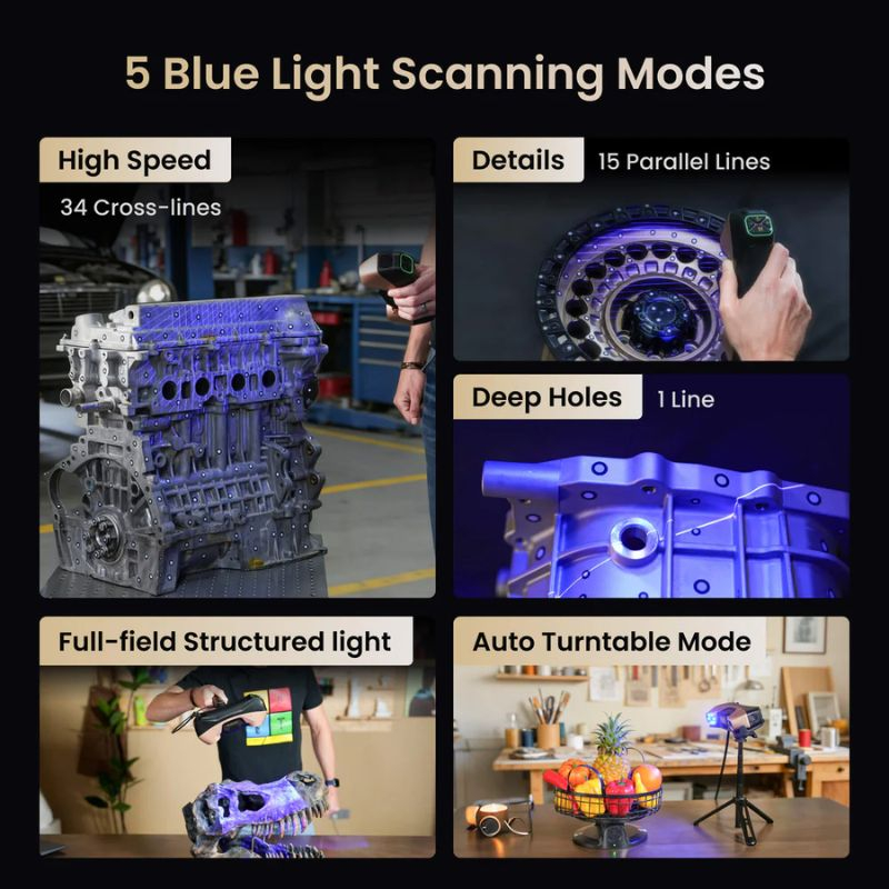 Este modo utiliza 34 líneas láser cruzadas para capturar rápidamente superficies grandes. Alcanza hasta 3.000.000 puntos/s, ideal para piezas industriales.