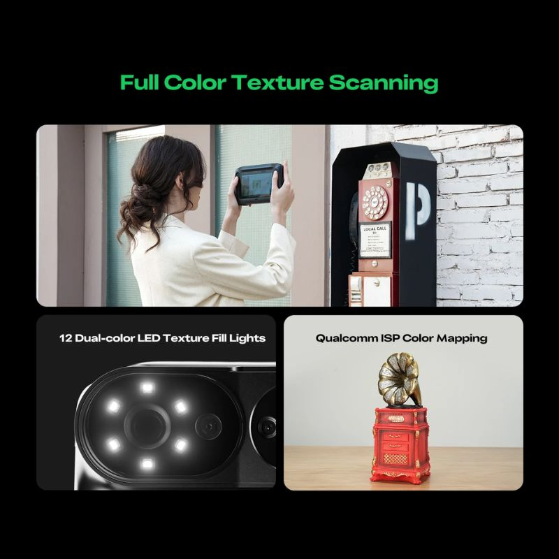 La cámara RGB con obturador global y el procesador Qualcomm aseguran texturas ricas y naturales, complementadas con iluminación auxiliar para capturas fotorrealistas.