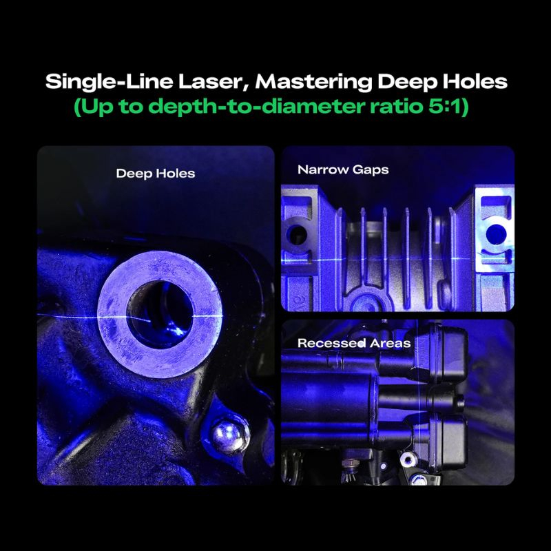 Captura datos precisos incluso con una relación profundidad/diámetro de hasta 5:1, garantizando una digitalización completa de piezas mecánicas.