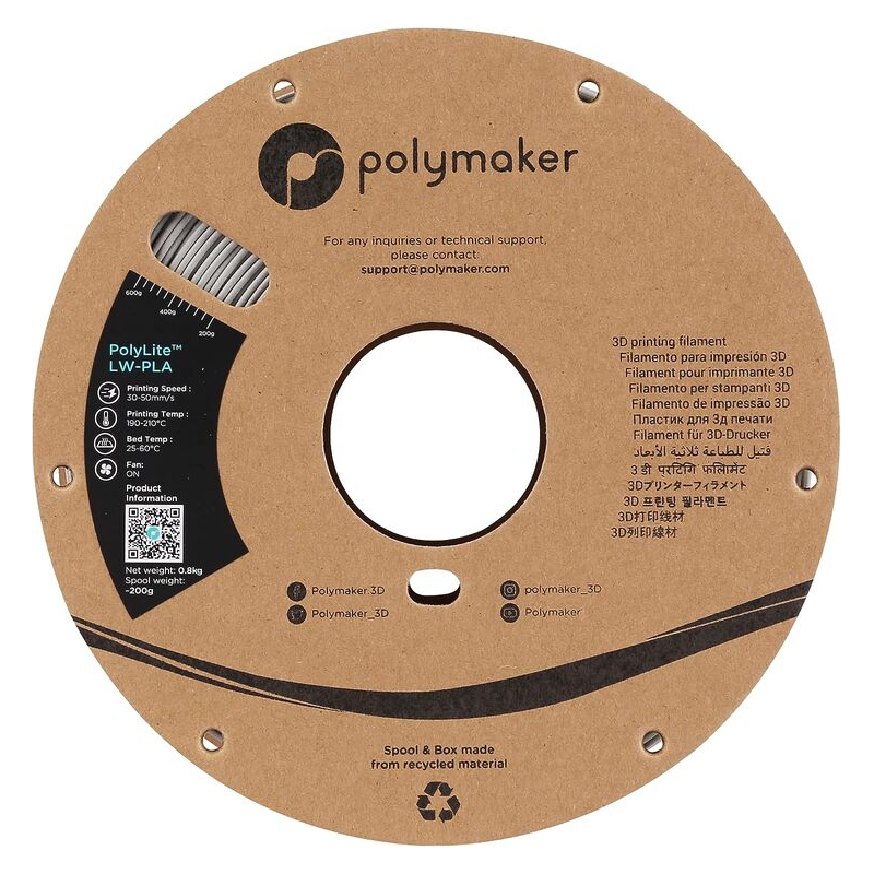 El PolyLite™ LW-PLA Gris de Polymaker es un PLA expandido especialmente diseñado para imprimirse con parámetros similares al PLA normal, pero con la mitad de peso y menor densidad.