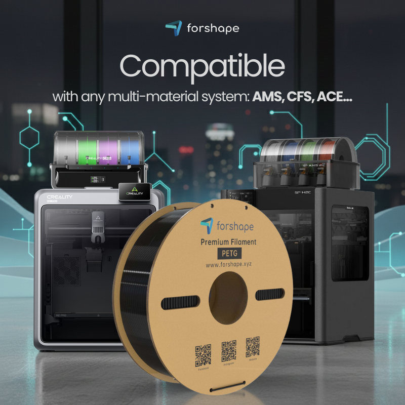 El PET-G Azul 1.75mm de Forshape es compatible con todas las impresoras 3D equipadas con extrusión de 1.75mm y que cumplan las recomendaciones de uso. También es compatible con sistemas multimaterial (AMS, CFS, ACE...).