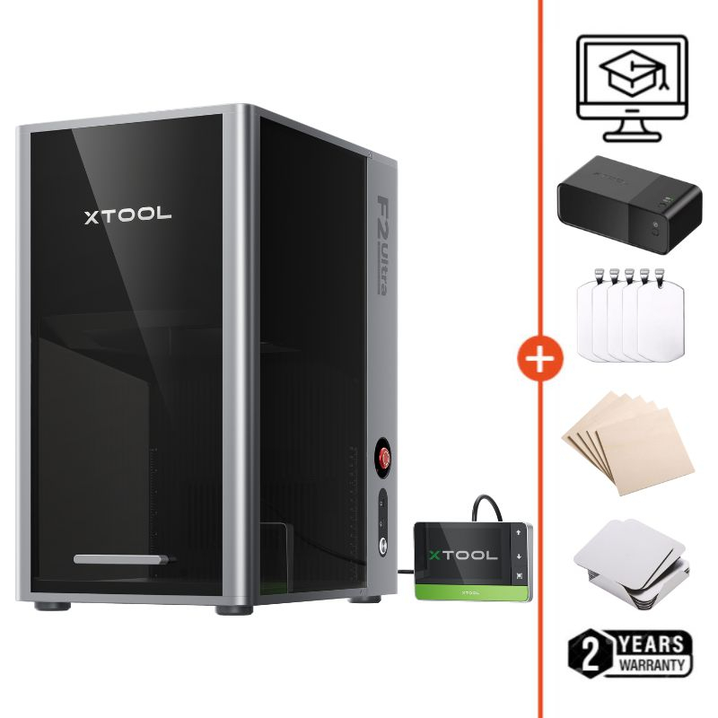 El F2 Ultra xTool es un grabador láser profesional altamente versátil, equipado con un doble láser (fibra MOPA de 60W + diodo de 40W) para una compatibilidad total con metales y materiales orgánicos.