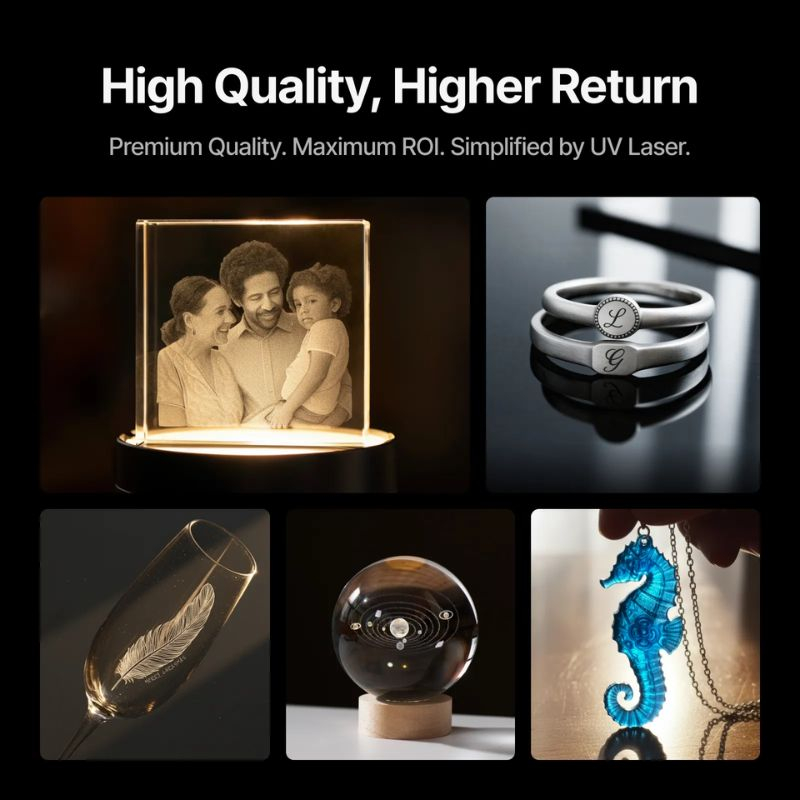 El xTool F2 Ultra UV está diseñado para talleres, joyería, prototipos y aplicaciones industriales que requieren una precisión extrema. Su tecnología de láser UV permite grabar materiales frágiles o transparentes sin generar calor excesivo, asegurando resultados limpios y detallados.