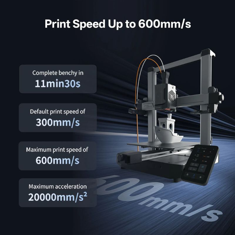 La Kobra 3 V2 ofrece velocidades impresionantes (hasta 600 mm/s), adecuadas para prototipado rápido y producción de pequeñas series.