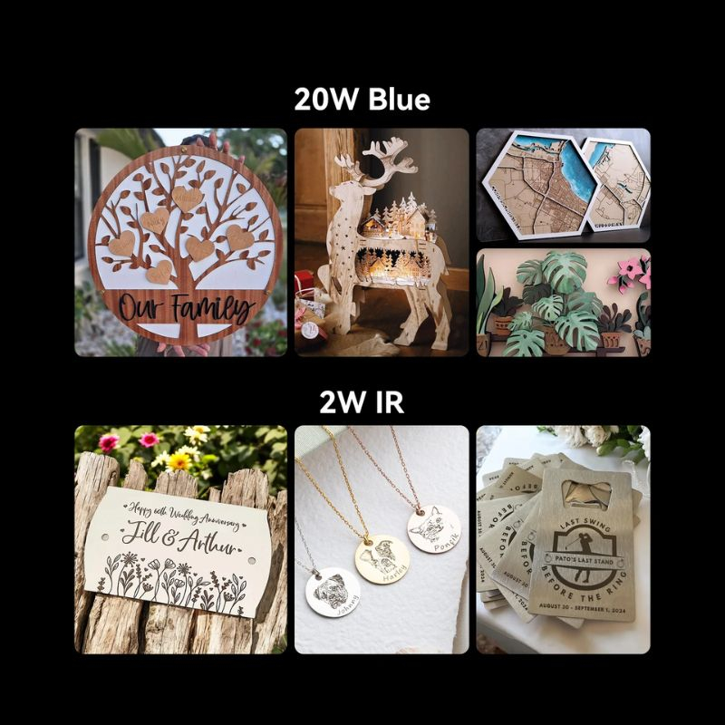 Con la posibilidad de añadir un módulo láser infrarrojo de 2W, el Falcon A1 Pro puede trabajar con una gran variedad de materiales, desde madera, papel, tela y cuero hasta acero inoxidable, metal chapado, cobre, plata, aluminio, así como cerámica, piedra, mármol o ladrillo.