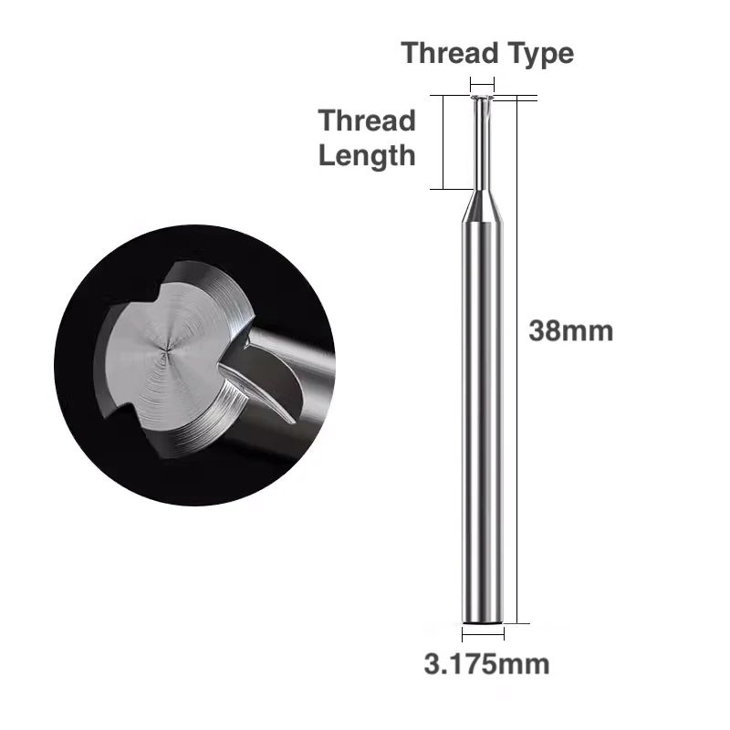 La fresa roscadora M1 (Ø 0,7 mm) x 3 mm Makera Carvera es una herramienta de roscado CNC diseñada para tornillos pequeños y accesorios roscados. Con geometría adaptada para crear roscas internas precisas en micro piezas metálicas o plásticas, se monta fácilmente en el husillo gracias a su vástago de 3,175 mm (1/8").