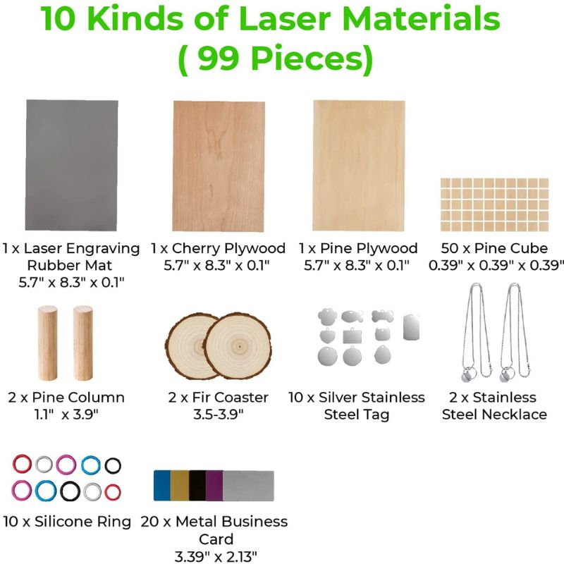Con este pack completo, podrás dar vida a todos tus proyectos creativos: decoración del hogar, objetos de madera personalizados, tarjetas de visita grabadas, rompecabezas de colores, y mucho más. Cada material viene con ajustes de grabado recomendados para ayudarte a obtener resultados óptimos desde el primer uso.