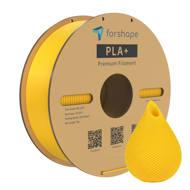 Se imprime con mucha facilidad y se adhiere perfectamente a la base de impresión. Ideal para piezas decorativas, diseños innovadores o prototipos visuales. La bobina de 1 kg de PLA+ Amarillo Forshape se entrega con un diámetro de 1,75mm.