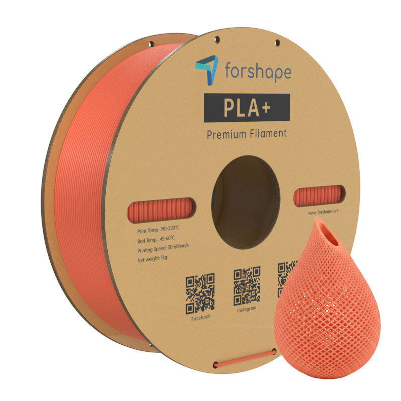 Se imprime con mucha facilidad y se adhiere perfectamente a la base de impresión. Ideal para piezas decorativas, diseños innovadores o prototipos visuales. La bobina de 1 kg de PLA+ Naranja Forshape se entrega con un diámetro de 1,75mm.