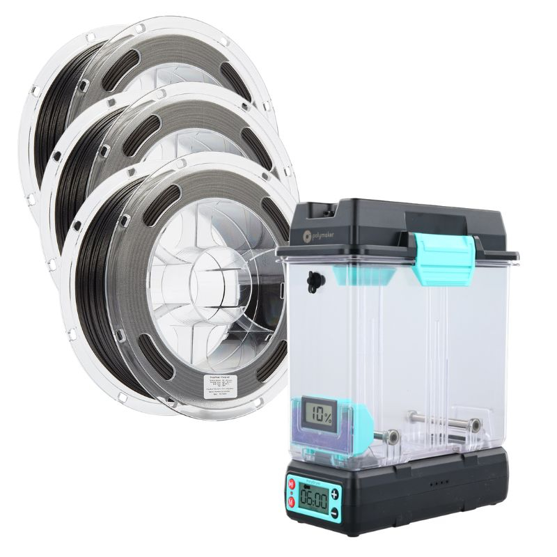 Este pack de Polymaker combina PolyMide PA12-CF Negro y el PolyDryer Polymaker para satisfacer las necesidades de las impresiones 3D técnicas más exigentes. Desarrollado con tecnología “Warp Free”, este filamento de nylon 12 reforzado con fibra de carbono ofrece excelentes propiedades mecánicas y térmicas, reduciendo el warping. Combinado con el PolyDryer, mantiene condiciones óptimas de impresión al reducir la humedad, garantizando resultados constantes y fiables.