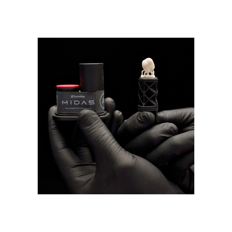 Estas cápsulas son compatibles con la impresora 3D SprintRay Midas, ofreciendo una integración óptima para una producción rápida y fiable de restauraciones dentales.