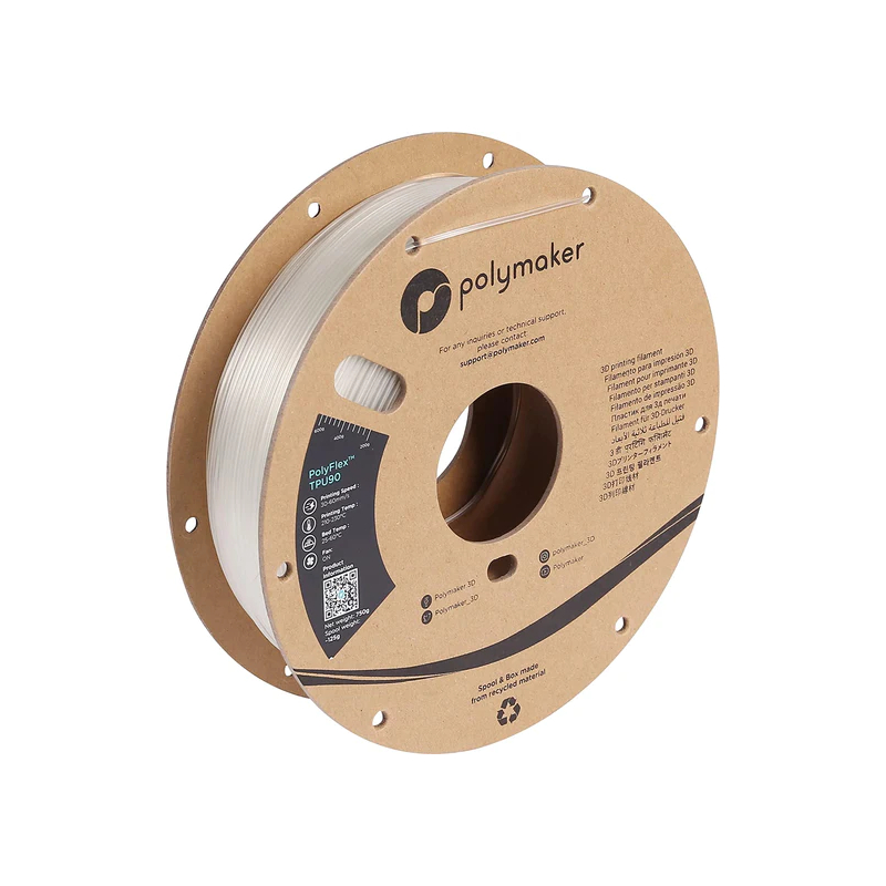 PolyFlex TPU90 Clear de Polymaker es un filamento translúcido y flexible ideal para piezas resistentes a los rayos UV y al desgarro.