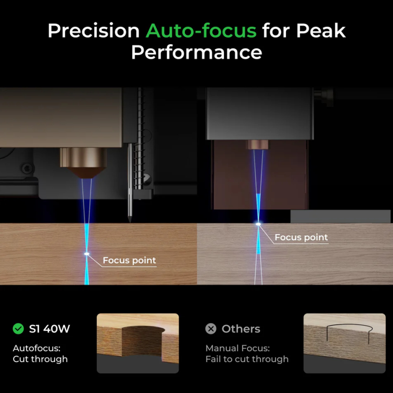 La xTool S1 ofrece una medición precisa del enfoque a nivel del ordenador y mejora la potencia de corte guiando el punto por debajo de la superficie de corte mediante el sistema de autoenfoque.