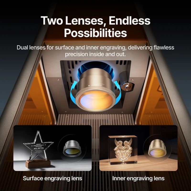 Para grabados internos en vidrio u otros materiales sensibles, se dispone de un área de 70 × 70 mm, con lentes intercambiables que permiten cambiar fácilmente entre grabado superficial y grabado interno.