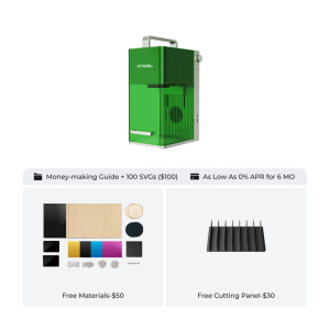 Pack láser completo que combina el cortador CO2 xTool P2S, el grabador xTool F1, transportador, base elevadora, extracción RA3 y SafetyPro™ para una producción fluida, precisa y segura.